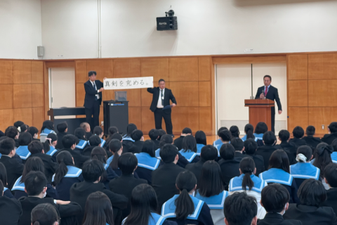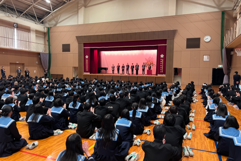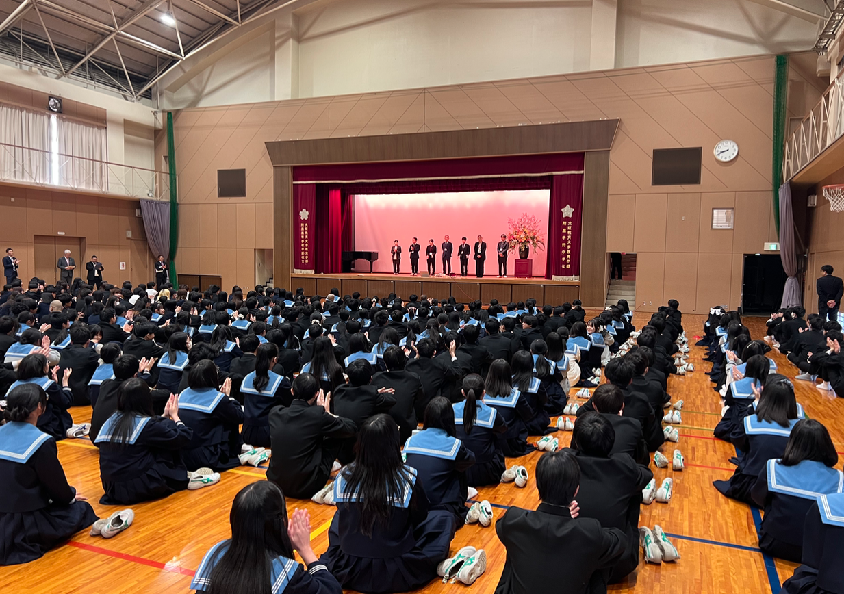 令和8年度 着任式・始業式 2026/04/08 中高合同による着任式および始業式を実施しました。 新たに着任された校長先生からは、「日本一ポジティブな学校を目指そう!」と挨拶があり、学校スローガンである「真剣を究める。」の発表もありました。 全校集会では、各学年の教員紹介が行われ、生徒たちからは大きな拍手や歓声があがるなど、温かく活気ある雰囲気に包まれました。 新たな担任の先生やクラスメイトと充実した1年間を過ごしていきましょう!