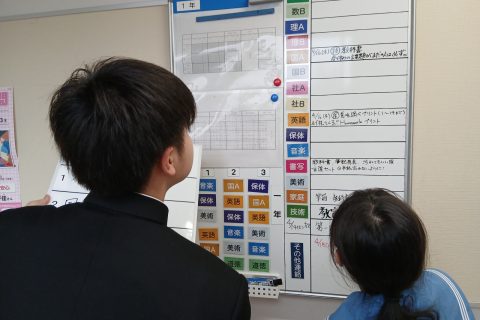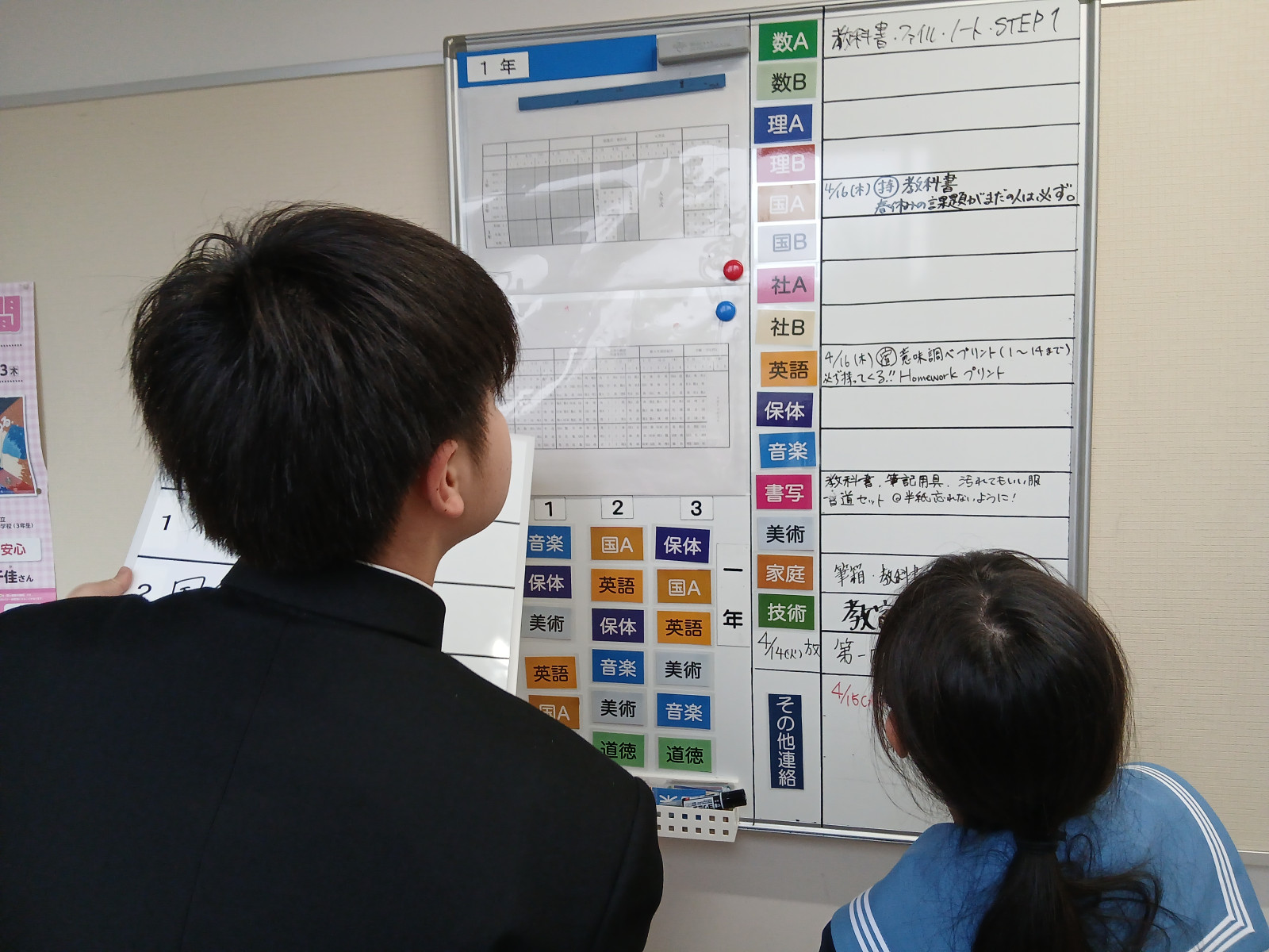 廊下を進むと、掲示板の前では、生徒が何やら持参のホワイトボードにマーカーで書き写している。クラスの日直が、明日の時間割や各教科からの課題等を書き写しているようだ。それを自分たちのクラスに掲示して伝えるシステムらしい。ここで間違えたり、抜けがあったりするとクラス全員に伝わらないため、日直も真剣だ。