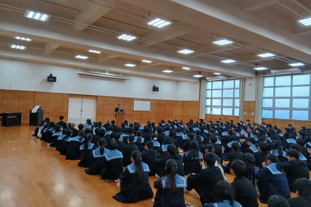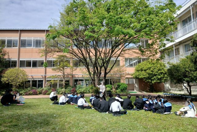 1限の会議が終わり2限め、しばらくすると中庭から声がする。窓から覗くと中学3年生を前に国語教員が話