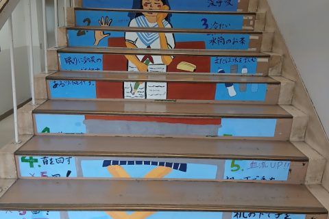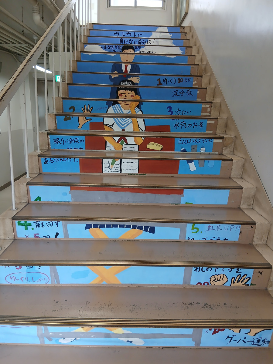 新入生歓迎会も含め、年度当初の行事も終わり、本日から通常の6限授業が開始されたので、午後の授業を見学した。昼食を済ませた後でもあるし、13時以降は『魔の眠気』といわれる体内時計のリズムによる眠気が襲う時間帯。それでも生徒たちはそんな態度を見せず、一生懸命集中して話を聞いている。校内の階段には下の写真のようなイラストも掲示されており、皆自覚はあるようだ。感心、感心。